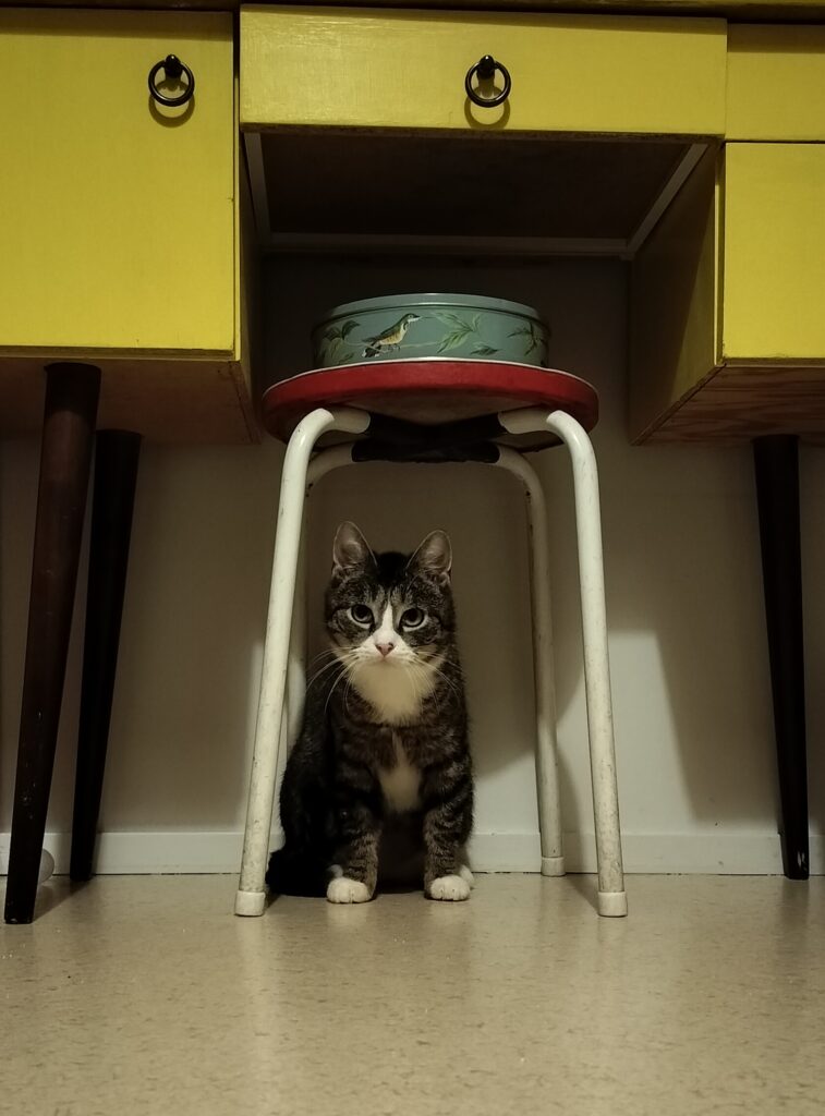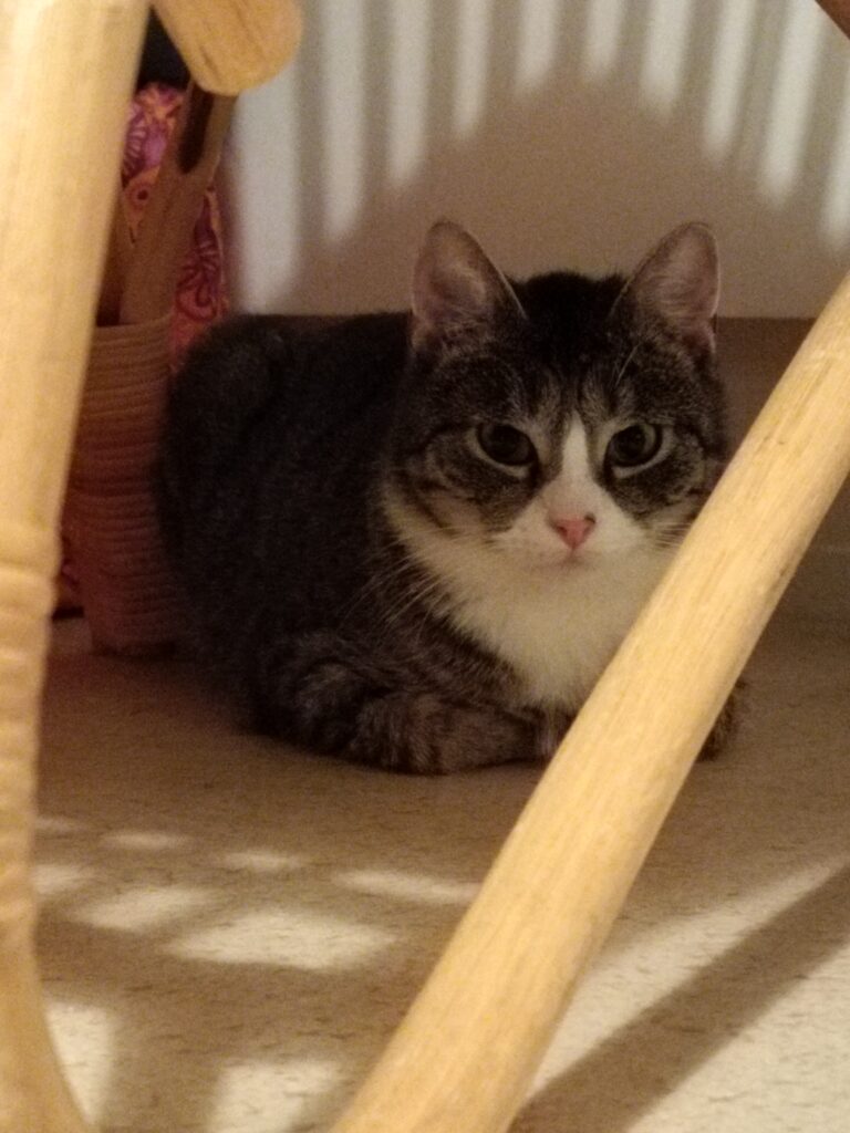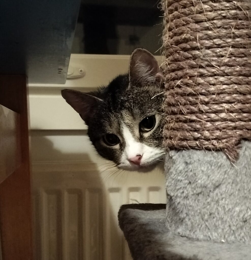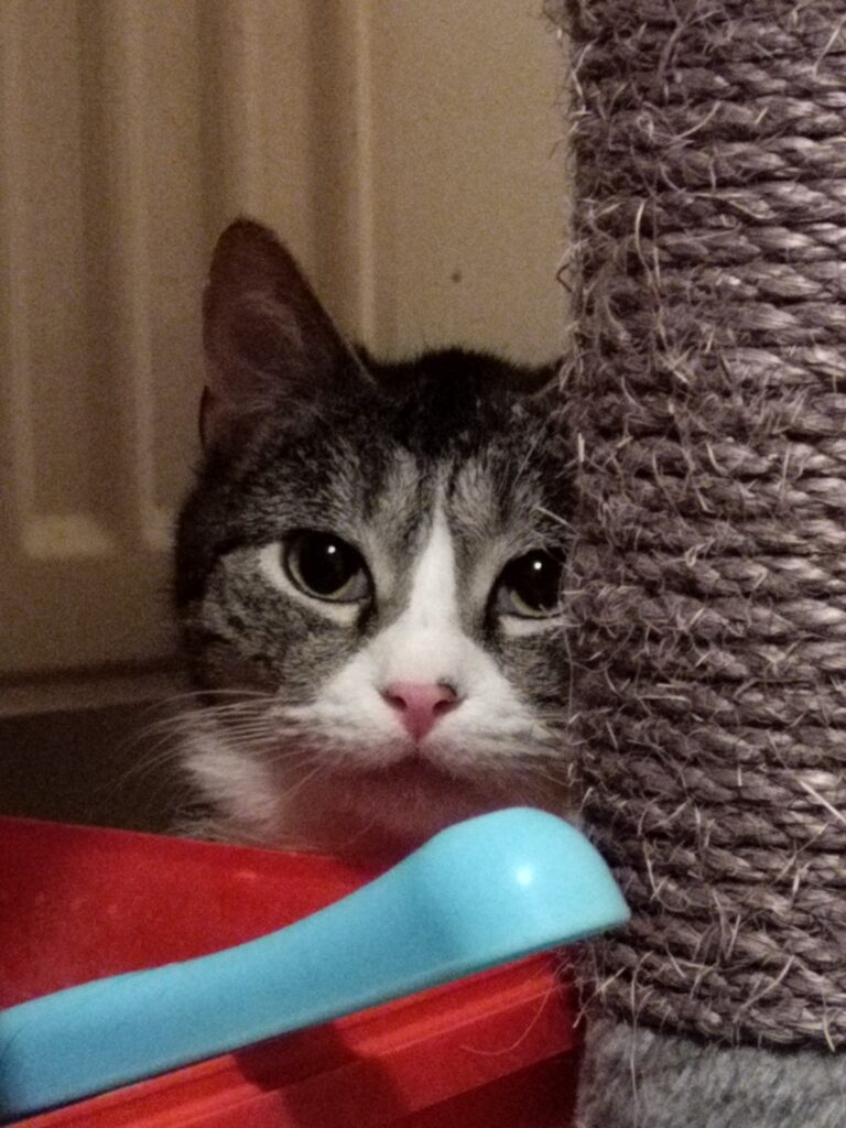 Elsa tuli helmikuussa ensikotiin. Ensimmäisen viikon tämä näkymätön neiti piti ensikodin varpaillaan syömättömyyden kanssa. Lopulta öisistä buffettarjoiluista löytyi jotain mieleistä. Edelleen Elsa syö piilossa ja lähinnä öisin. Pieni nirsoilu saattaa olla hänelle tulevaisuudessakin ominaista. Kuivaruoka kelpaa kyllä mainiosti.