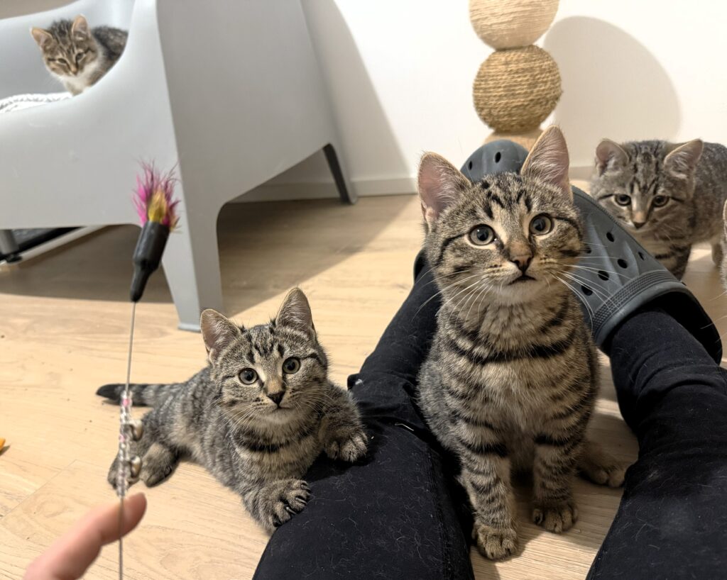 Joyce and the kittens are not yet fully accustomed to people. They all still need time and patience to continue socializing, but progress is being made all the time. The kittens are very playful, curious, and brave. Joyce is still timid, but already comes close to eat, meows sweetly, and bravely comes close to people for treats.