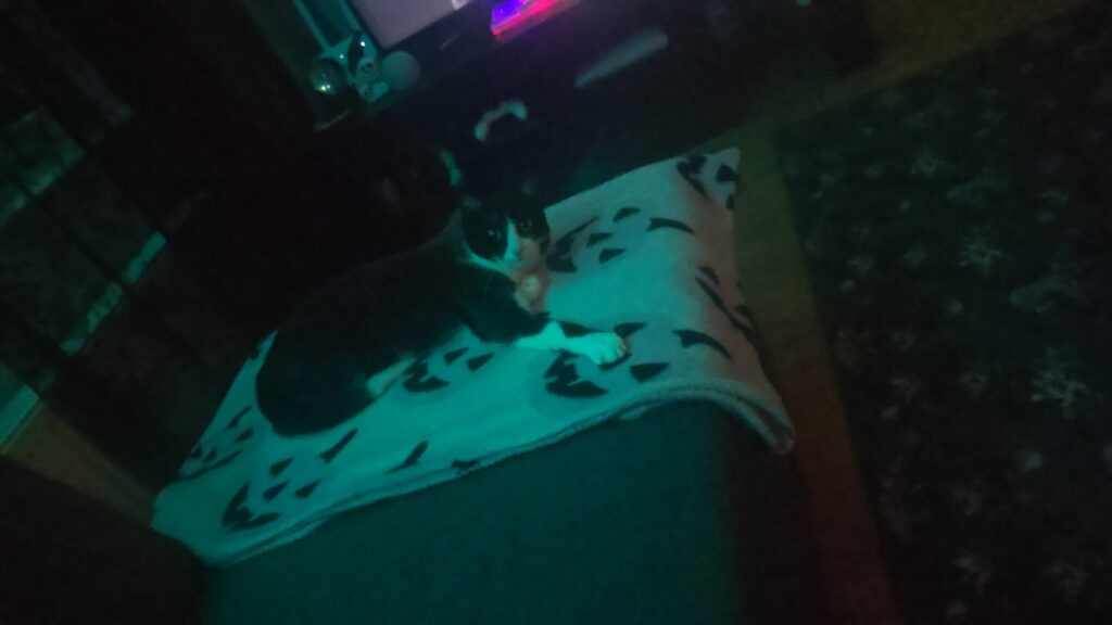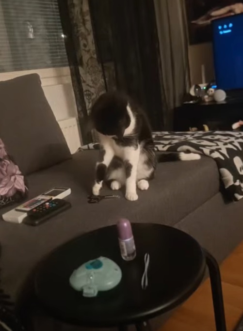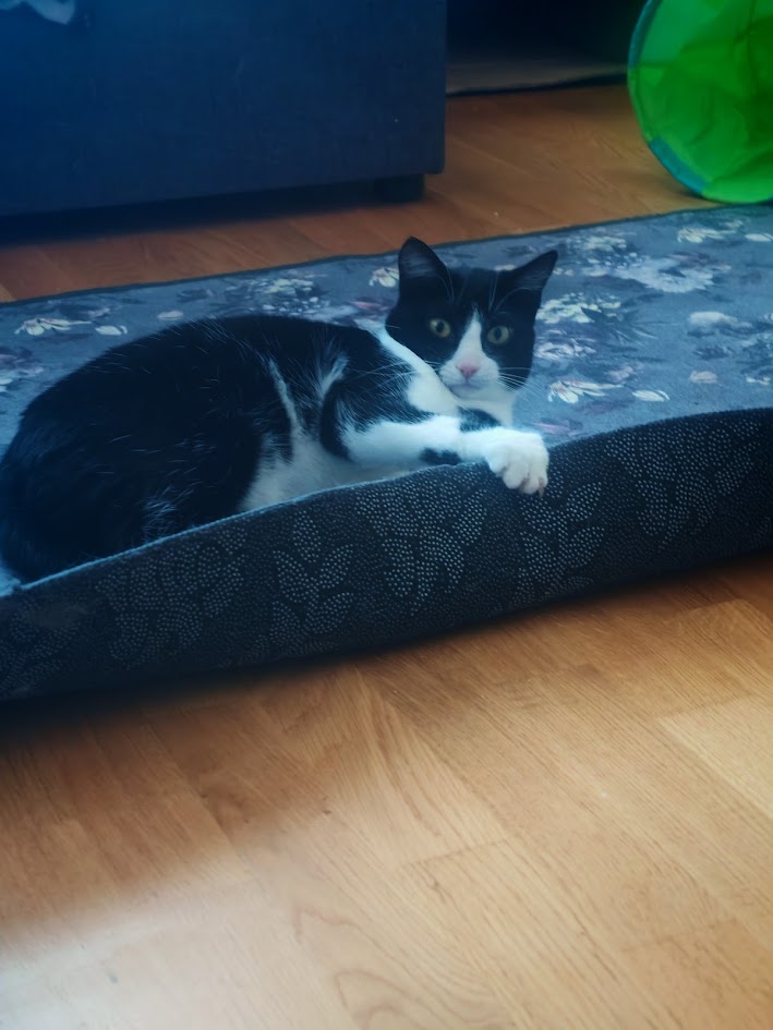 Kristiina ei vielä anna koskea itseään, ainakaan ihan hirveästi, vaan luikkii etäämmälle. Uudessa kodissa olisi siis hyvä olla toinen kiva kissakaveri. Ihmiseen tottuminen on jo edennyt alun sähinäpetteristä pitkälle, eli ennuste tämän suhteen hyvä.
