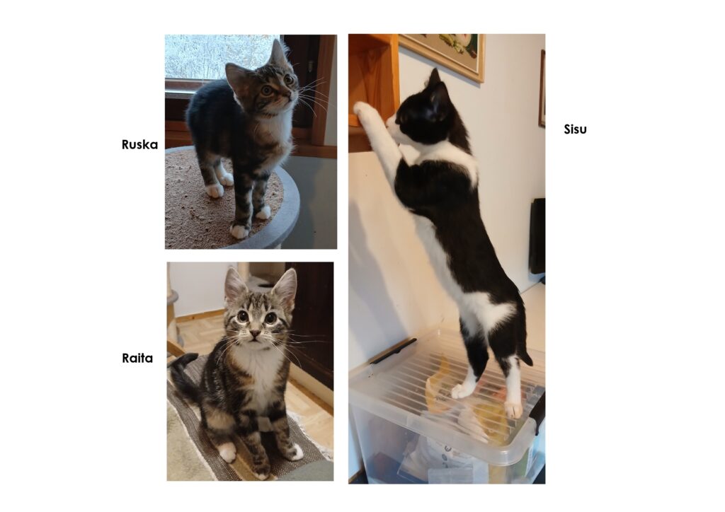 Pennut ovat tavanneet vain aikuisia ihmisiä. Raita ja Ruska näyttäisivät tutustuvan uusiin ihmisiin ennakkoluulottomasti, Sisu voi vähän ujostella vieraita. Pennuilla ole ollut mahdollisuutta tutustua koiriin tai muihin lemmikkilajeihin. Emoa ja sisaruksia lukuun ottamatta toiset kissatkin ovat toistaiseksi olleet näkyvillä vain verkko-oven takana, mutta kiinnostavat kyllä kovasti. Isosporaa ei ole enää kontrollinäytteissä todettu, joten vähitellen eristystä voi lähteä purkamaan.