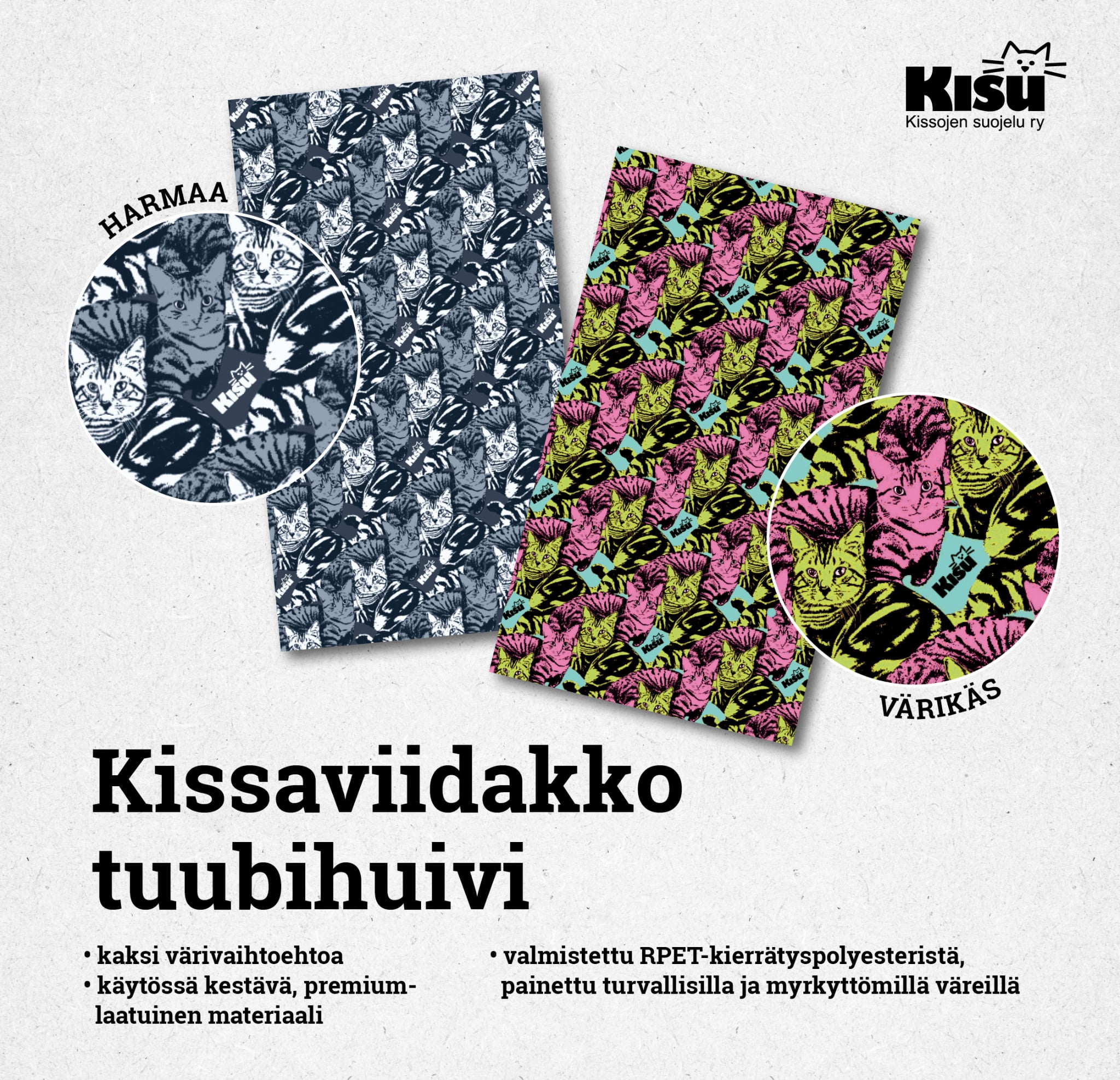 Kissaviidakko tuubihuivi, saatavilla kahdessa eri värissä; harmaa ja värikäs