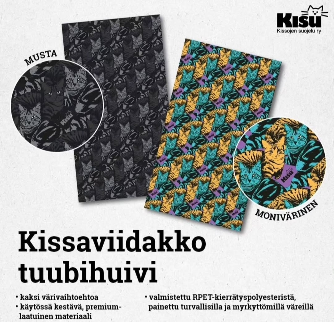 Kissaviidakko tuubihuivi, saatavilla kahdessa eri värissä; musta ja monivärinen